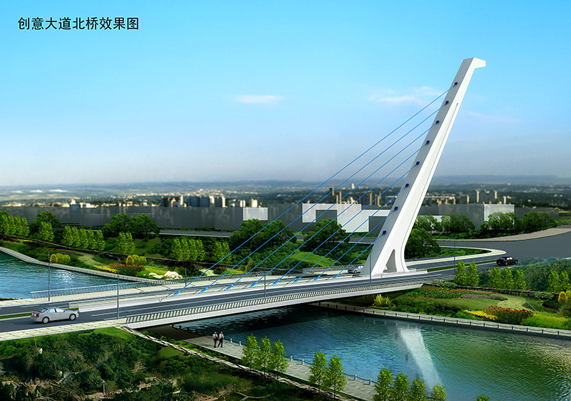 匯智橋路南、北橋均為無背索獨(dú)塔單索面斜拉橋,橋跨 82 米,全寬 33.5 米;智力島路橋為單跨新型斜靠式拱
